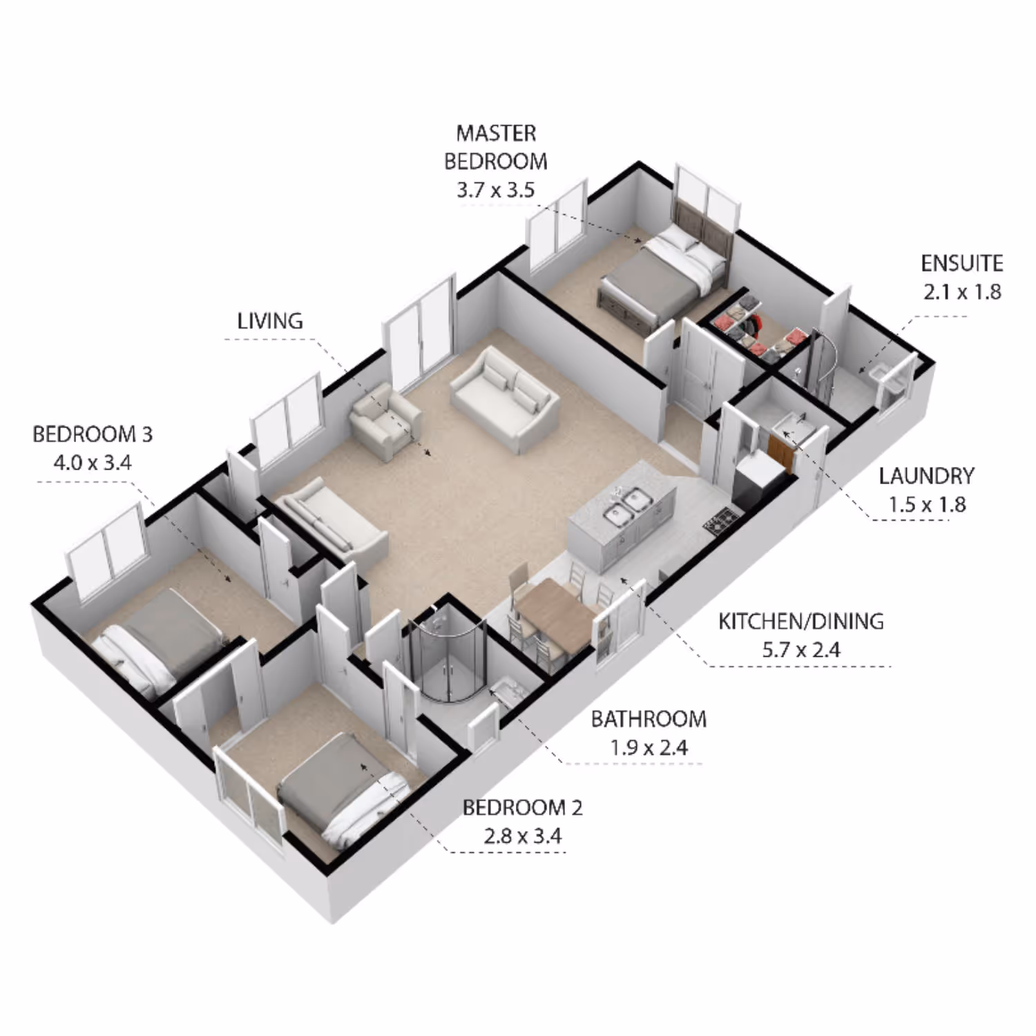 Filled to the brim with value the Tekapo features a central living area flanked by double bedrooms.